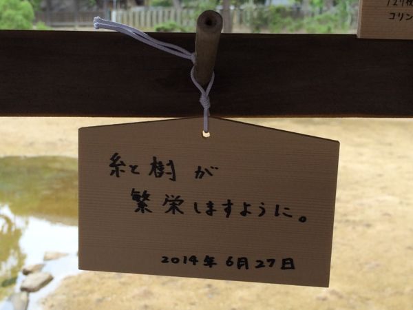 厳島神社でお参りをしていると、なんと友人が絵馬を書いてくれました